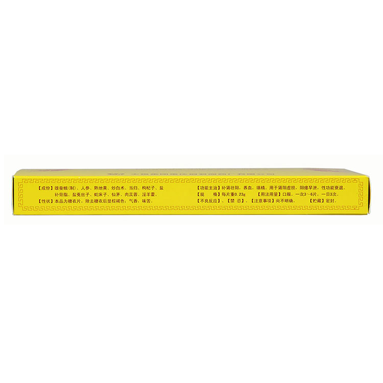 【功能主治/适应症】补肾壮阳,养血,填精。用于肾阳虚损,阳萎早泄,性机能衰退等症。