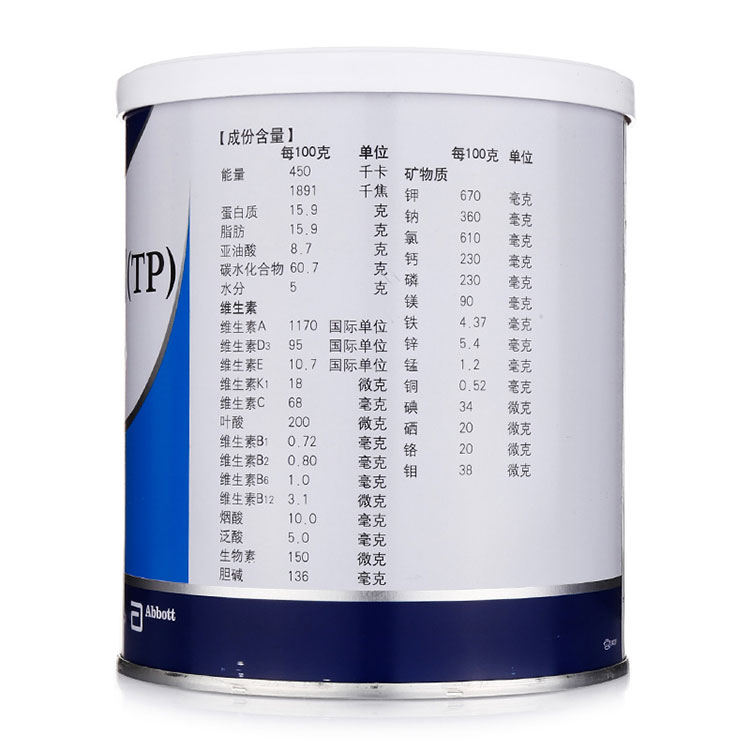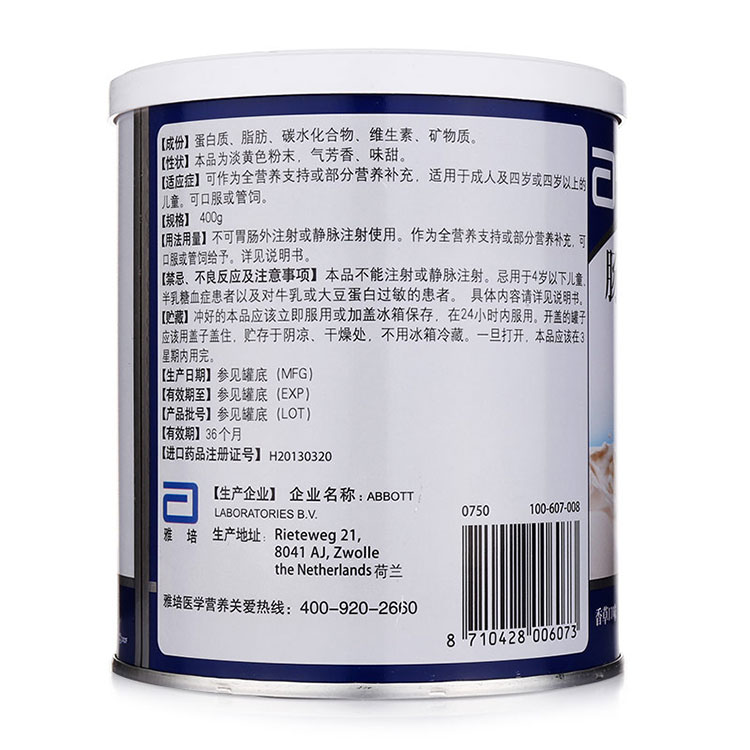 用法用量 1.配制:往杯中注入200毫升温开水,徐徐加入六量匙(量匙在罐中)即55.8克安素粉,搅拌至完全溶解,制成250毫升安素液,每毫升安素液约提供一大卡热量,每罐400克安素粉可调制250毫升的安素液7杯,可按病者的口味加入不同的调味剂(如巧克力、水果、花生等)。 2.管饲:遵照医生或营养师的嘱咐,当进行管饲时,滴速、用量和浓度必须根据病情和患者的耐受性而定,配制使用时,谨防污染。