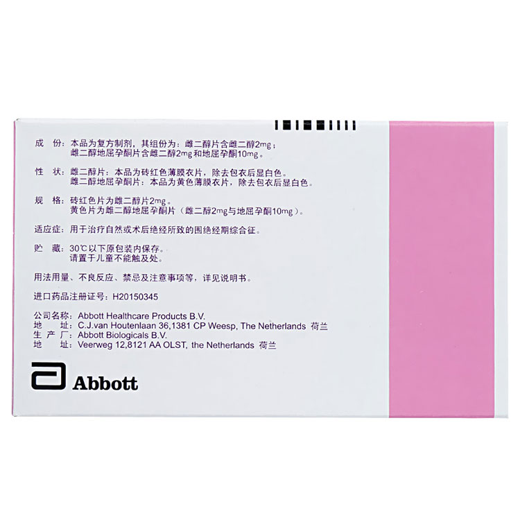 成  份 14片雌二醇片(砖红色片):每片含雌二醇2mg;14片雌二醇地屈孕酮片(黄色片):每片含雌二醇2mg和地屈孕酮片10mg。