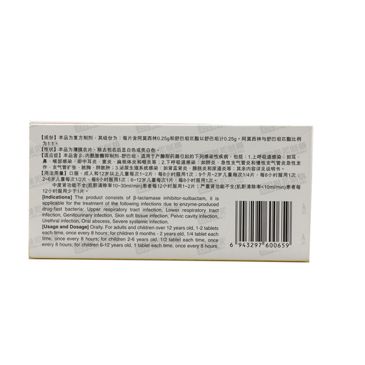 【功能主治/适应症】本品适用对阿莫西林耐药但对本品敏感的产β-内酰胺酶致病菌引起的下列轻、中度感染性疾病,包括:1.上呼吸道感染:如耳、鼻、喉部感染,即中耳炎、鼻窦炎、 扁桃体炎和咽炎等;2.下呼吸道感染:如肺炎、急性支气管炎和慢性支气管炎急性发作、支气管扩张等;3.泌尿生殖系统感染:如膀胱炎和尿道炎、肾盂肾炎、妇科感染、产后感染等;4.皮肤及软组织感染:如蜂窝组织炎、伤口感染、疖病、脓性皮炎和脓疱病,性病,淋病等;5.口腔感染:如口腔脓肿、手术用药等;6.其他感染:如细菌性心内膜炎、腹膜炎、骨髓炎、伤寒和副伤寒、预防心内膜炎等。