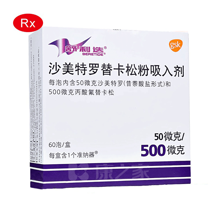 成 份 本品为复方制剂,其组分为:沙美特罗(以昔萘酸盐形式)和丙酸氟替卡松。 每泡含沙美特罗50微克和丙酸氟替卡松500微克。