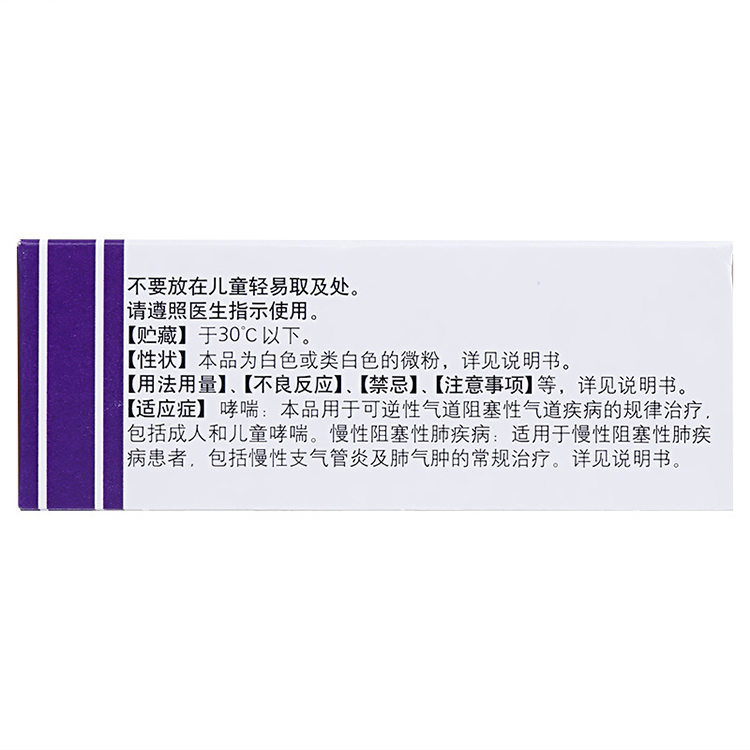 药品性状 本品为白色或类白色的微粉,密封在铝箔条内。该铝箔条缠绕在一模制的塑料装置中,这种给药装置称为准纳器®。患者通过准纳器®吸嘴吸入药物。
