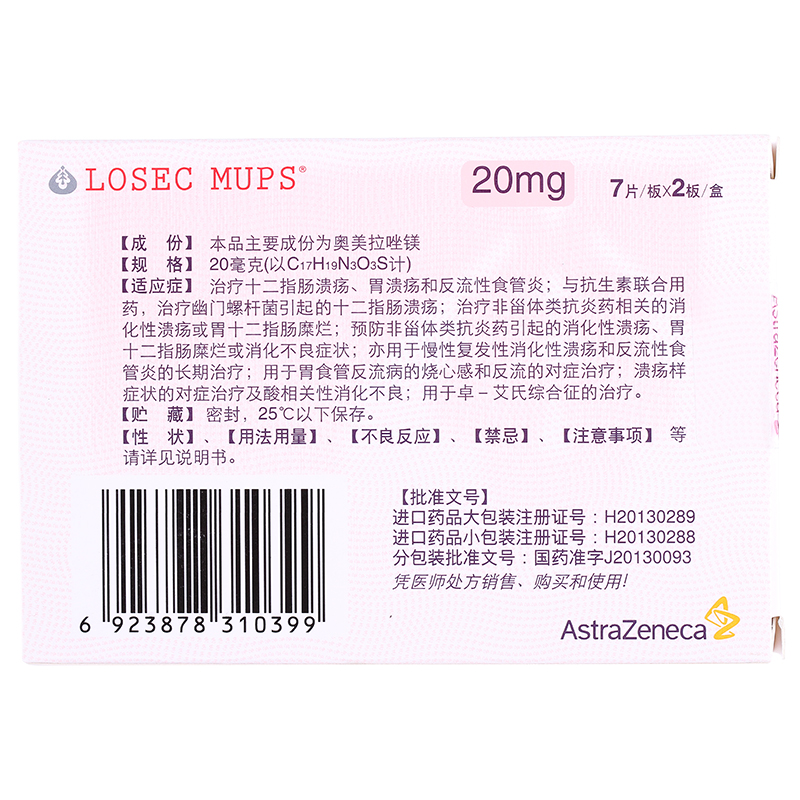 【功能主治/适应症】治疗十二指肠溃疡、胃溃疡和反流性食管炎;与抗生素联合用药,治疗幽门螺杆菌引起的十二指肠溃疡;治疗非甾体类抗炎药引起的消化性溃疡或胃十二指肠糜烂;预防非甾体类抗炎药引起的消化性溃疡、胃十二指肠糜烂或消化不良症状;亦用于慢性复发性消化性溃疡和反流性食管炎的长期治疗;溃疡样症状的对症治疗及酸相关性消化不良;用于卓-艾氏综合征的治疗。