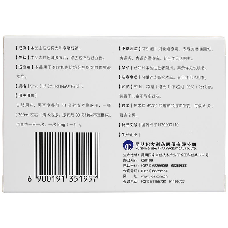 【药物相互作用】没有有关本品特殊的药物间相互作用的报道。本品不被代谢,也不诱导或抑制肝细胞色素酶P450 。钙剂/抗酸剂:本品与钙剂、抗酸剂以及含二价阳离子的口服制剂同服,会影响本品的吸收。激素替代治疗:如运用得当,本品可与激素联合使用。阿司匹林/非甾体抗炎药:在5700名病人参加的本品Ⅲ期临床试验中,31%病人服用阿司匹林,其中24%为规律服用,48%的病人服用了非甾体类抗炎药,其中21%为规律服用,结果显示服用阿司匹林/非甾体抗炎药的病人中,上消化道不良反应的发生率,本品组(24.5%)与安慰剂组(24.8%)相似。 H2 -受体阻滞剂和质子泵抑制剂:在上述同一试验中,21%病人服用H2 -受体阻滞剂和质子泵抑制剂,这些病人中,上消化道副反应的发生率,本品组与安慰剂组相似。