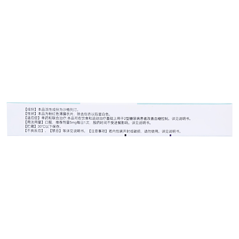 【药代动力学】吸收:5mg每日1次给药后,沙格列汀的中位达峰时间(Tmax)为2h,沙格列汀活性代谢物Tmax为4h。与空腹相比,高脂饮食后给药能使沙格列汀的Tmax延长约20min。沙格列汀餐后给药比空腹给药的AUC值提高27%。沙格列汀可与食物同时服用或分开服用。分布:沙格列汀及其活性代谢物在体外人血浆中的蛋白结合率可忽略不计。因此,各种疾病状态(如肾或肝功能不全)引起的血浆蛋白水平的改变不影响沙格列汀的分布。代谢:沙格列汀的代谢主要由CYP3A4/5介导。沙格列汀的主要代谢产物也是DPP-4抑制剂,其抑制活性作用是沙格列汀的二分之一。因此,CYP3A4/5强抑制剂和强诱导剂能改变沙格列汀及其代谢物的药代动力学。排泄:沙格列汀通过肾和肝排泄。单次给予5mg14C-沙格列汀后,尿中排泄出的沙格列汀、沙格列汀活性代谢物、总放射性物分别为给药剂量的24%、36%和75%。沙格列汀的平均肾清除率(~230mL/min)大于平均肾小球滤过率(~120mL/min),提示存在主动的肾脏清除。总共有22%的放射性物质在粪便中回收,提示部分沙格列汀通过胆汁排泄和/或部分未吸收的药物经胃肠道排泄。健康志愿者单次口服沙格列汀5mg后,沙格列汀及其活性代谢物的平均血浆半衰期(t1/2)分别为2.5h和3.1h。