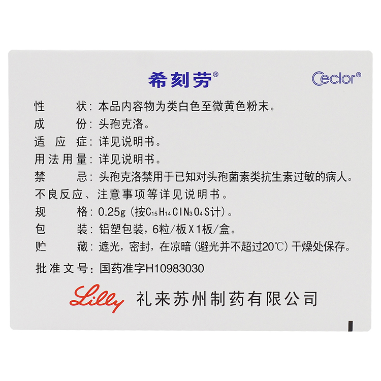 【主要成份】化学名称:(6R ,7R)-7-[(R )-2-氨基-2-苯乙酰氨基]-3-氯-8-氧代-5-硫杂-1-氮杂双环[4.2.0]辛-2-烯-2-甲酸一水合物。希刻劳分子式:C15H14ClN3O4S H2O 分子量:385.82