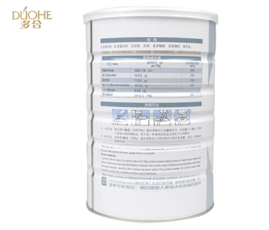 【产品成分】大豆蛋白粉、乳清蛋白粉、豆奶粉、乳粉、麦芽糖醇甜菊糖甙,食用盐
