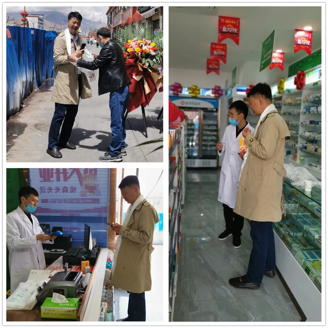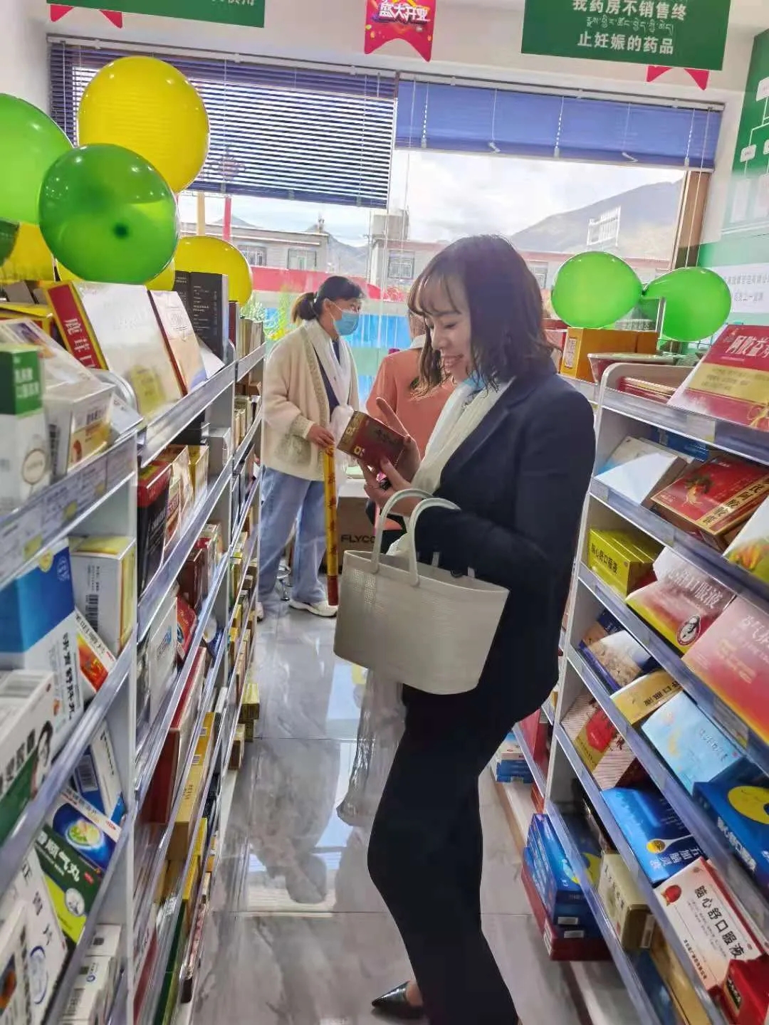 西藏阜康药店联合党支部书记杨国洪对王斌董事长的到来表示衷心的感谢,为王斌董事长献上了哈达,并向董事长简要汇报了该药店选址筹备到开业的过程,以及连锁药店的近期拓展计划。