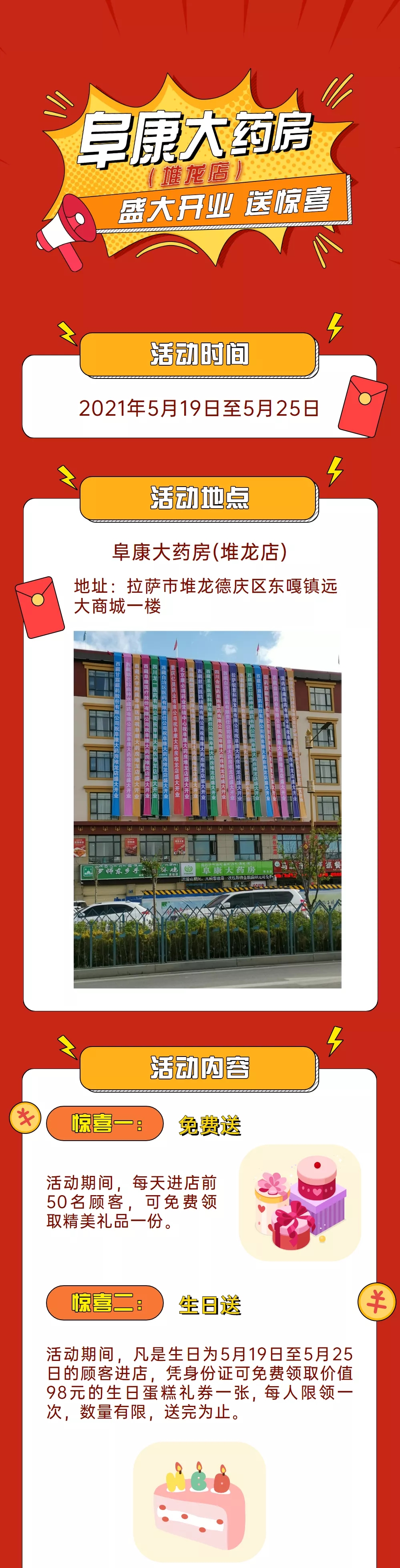 阜康大药房(堆龙店)开业送惊喜,举办了丰富的优惠活动,其活动如下: